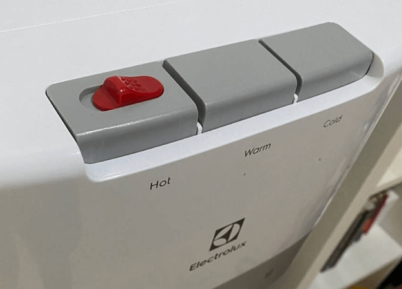 Kita harus menggeser tombol merah lalu secara bersamaan menekan tombol air panas nya lalu air panasnya akan mengalir.