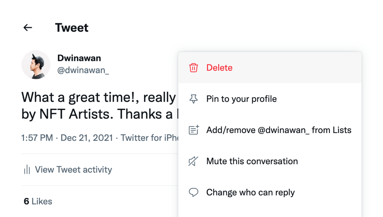 Klik icon titik tiga yang berada di pojok kanan tiap tweet, lalu akan muncul beberapa opsi, lalu klik opsi Delete yang terletak paling atas.