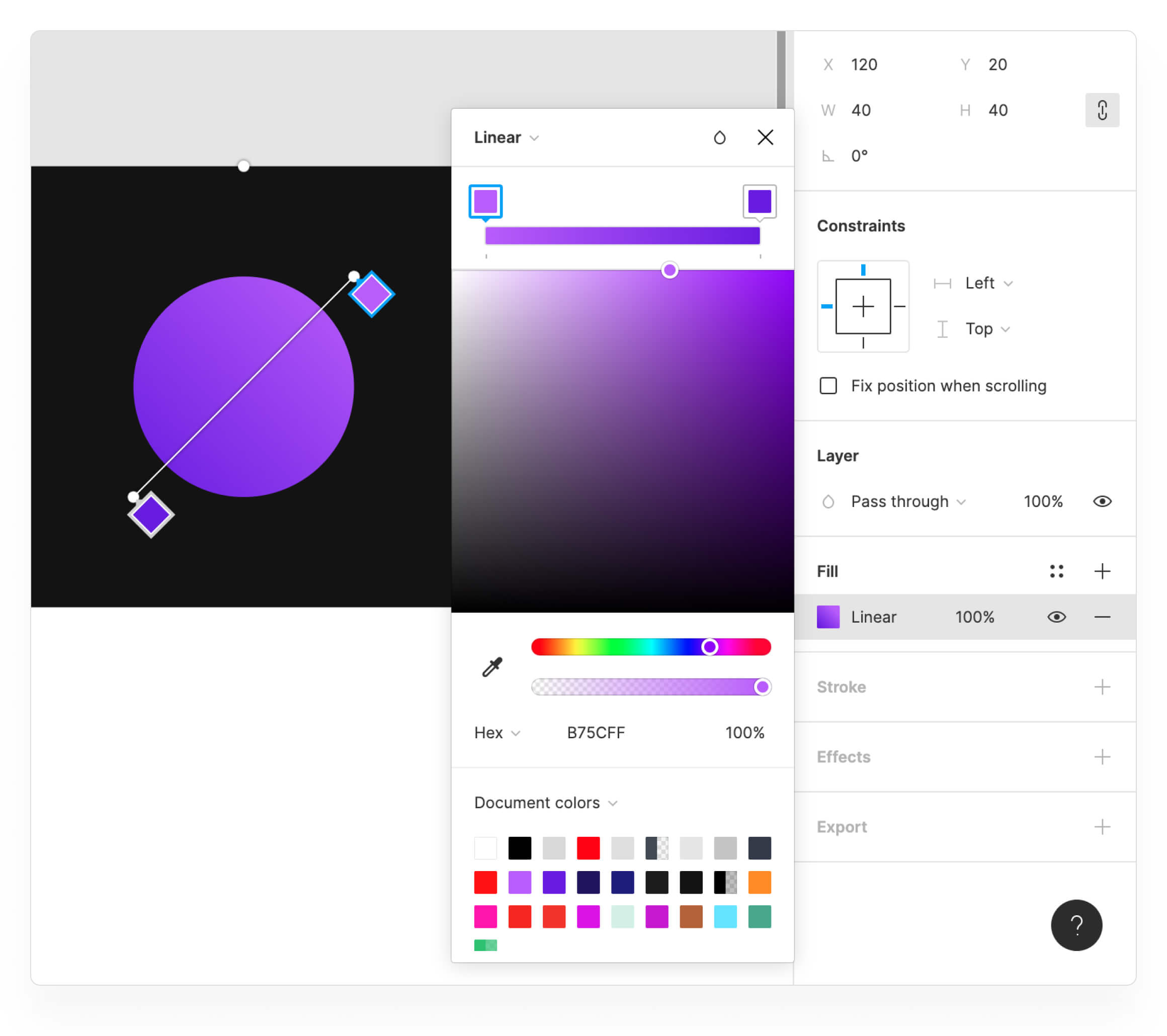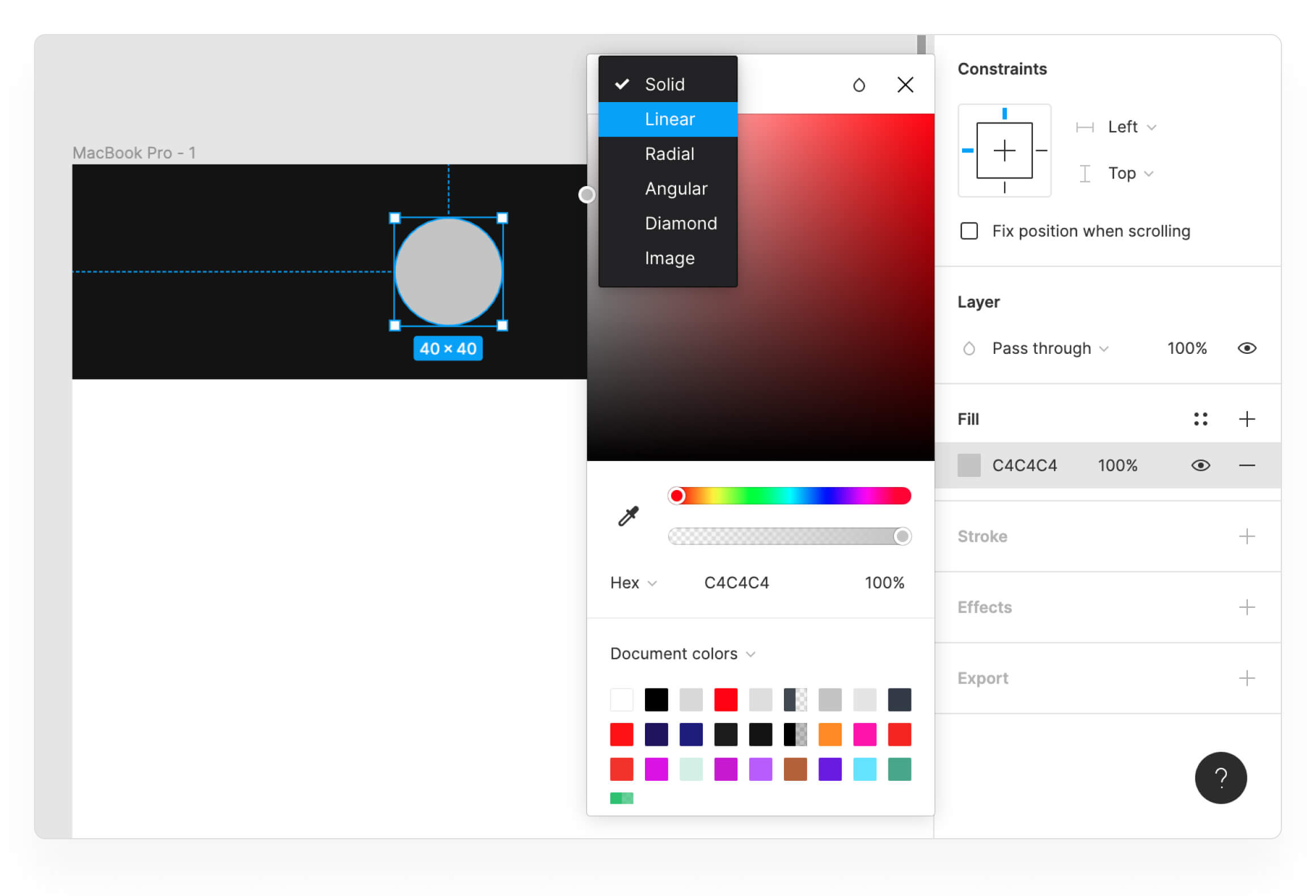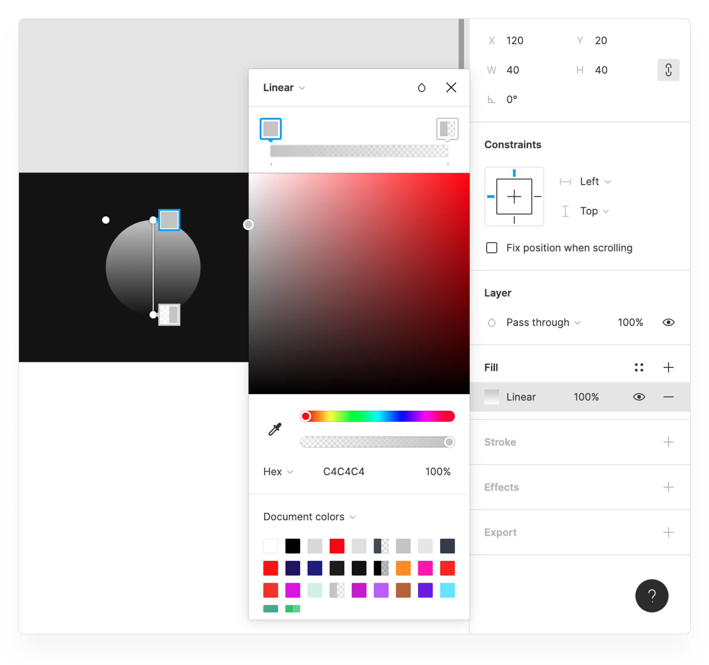 Kita akan memberi warna gradient pada lingkaran. Klik lingkaran, lalu pada toolbar sebelah kanan, klik kotak abu abu di bagian fill, lalu ubah tipe warna dari solid ke linear