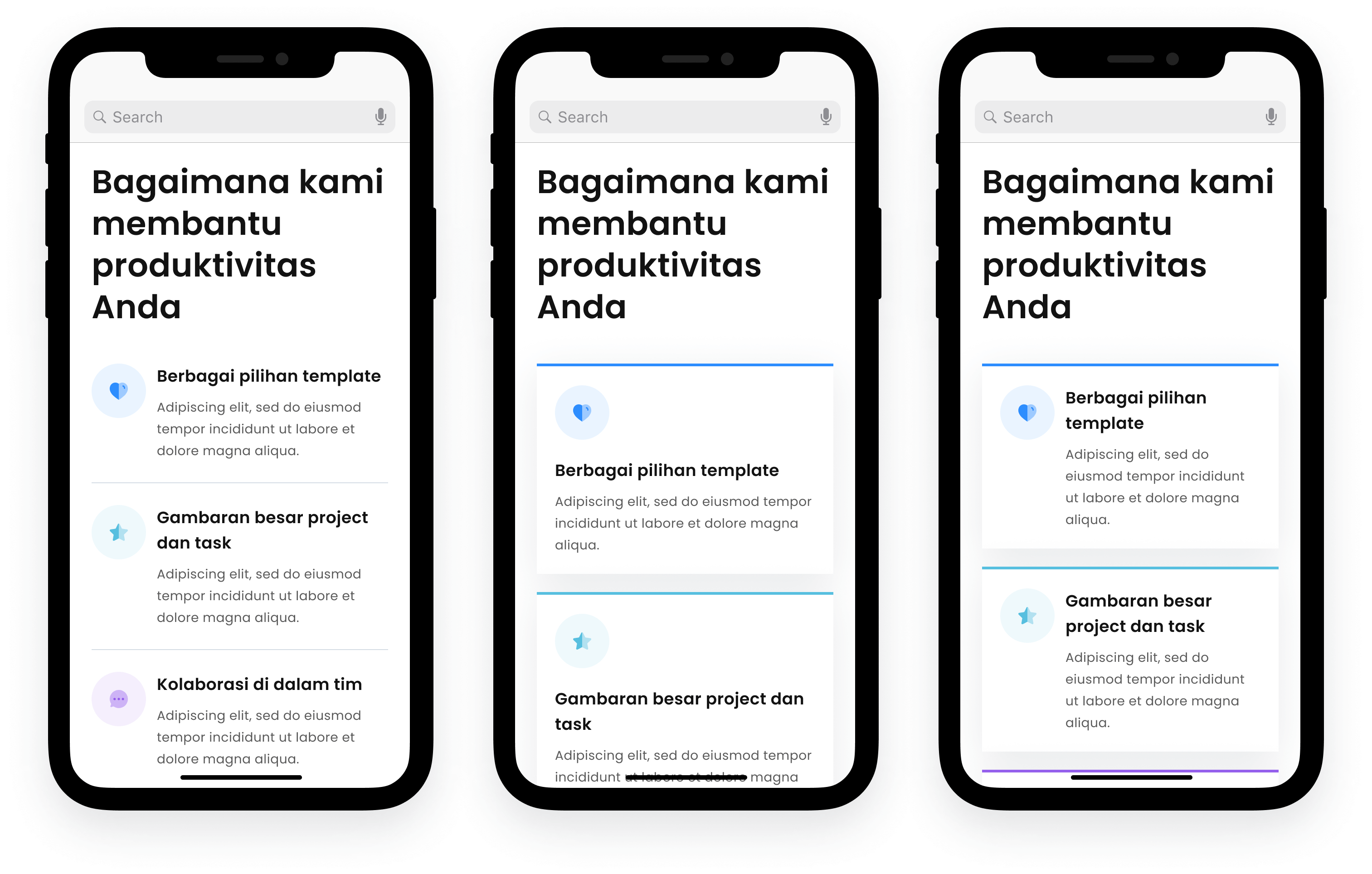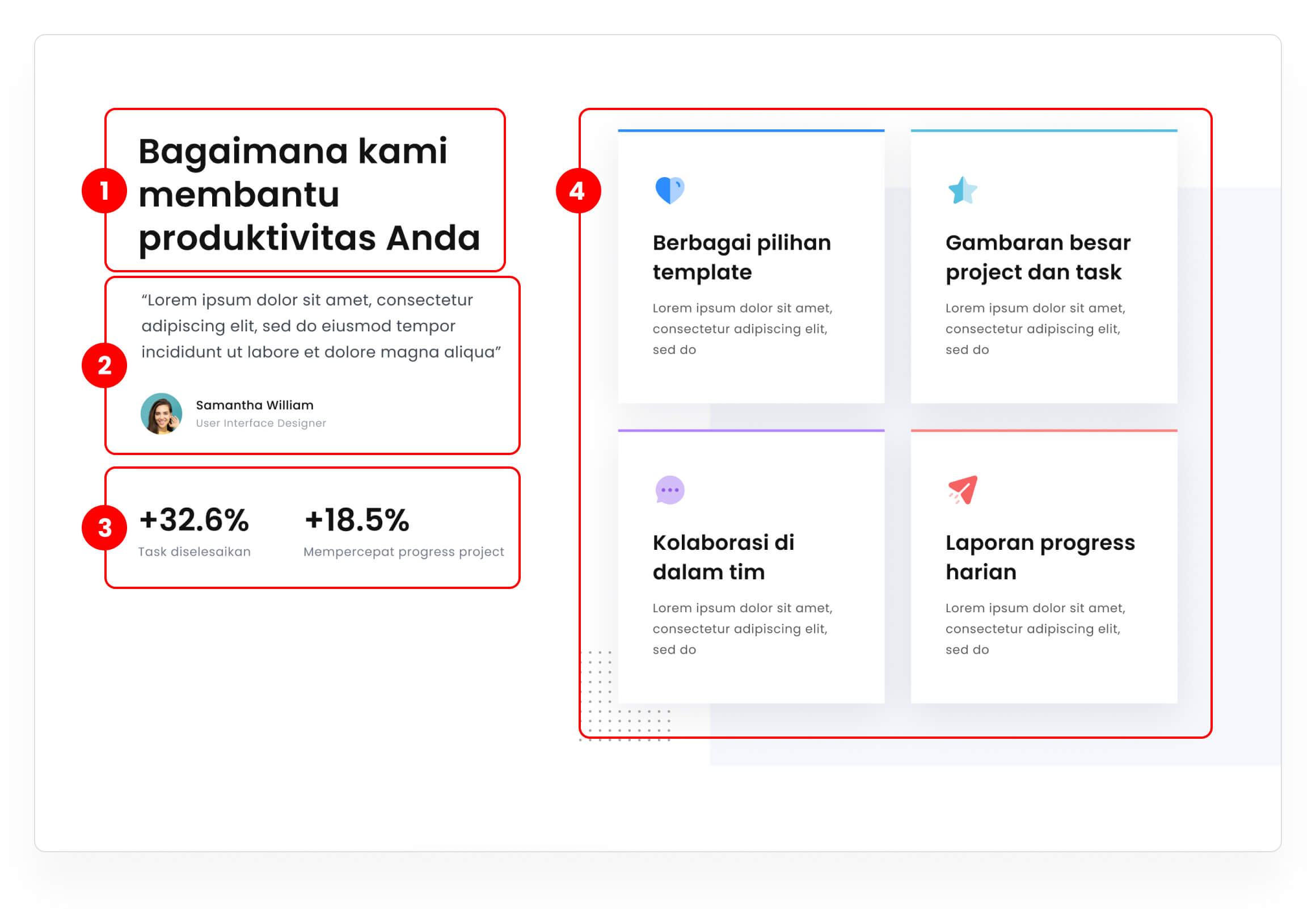 Judul section "Bagaimana kami membantu produktivitas Anda" akan sesuai jika dikelompokkan dengan "Info fitur".