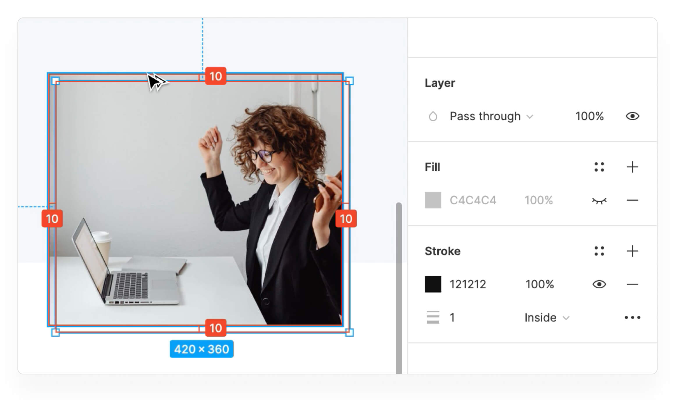 Buat sebuah kotak berukuran 420 x 360. Kosongkan bagian fill nya (mata tertutup) dan hanya berikan stroke sebesar 1px dengan warna #121212. Tempatkan di belakang gambar beri jarak 10px dari atas dan 10px dari samping kiri.