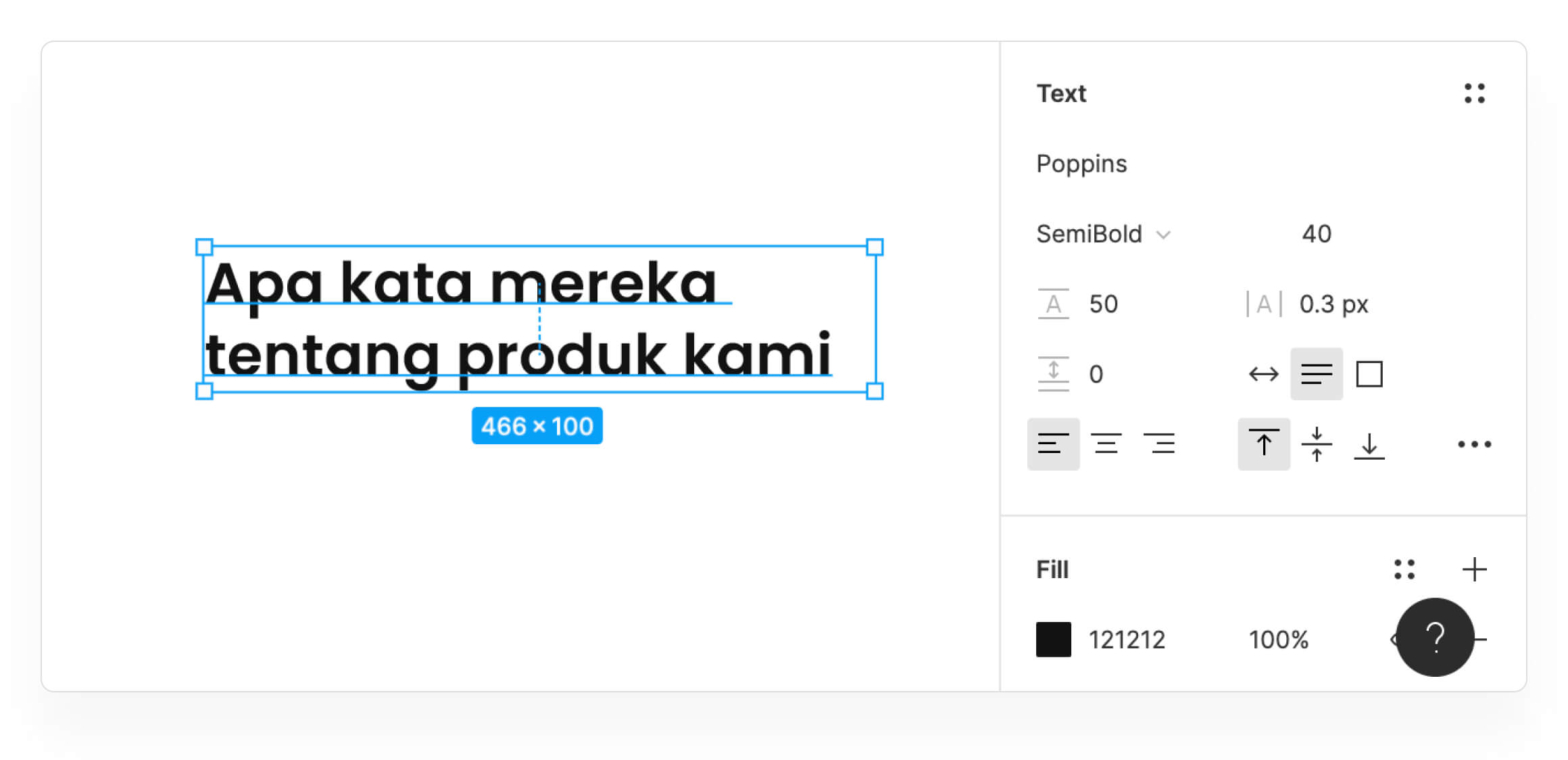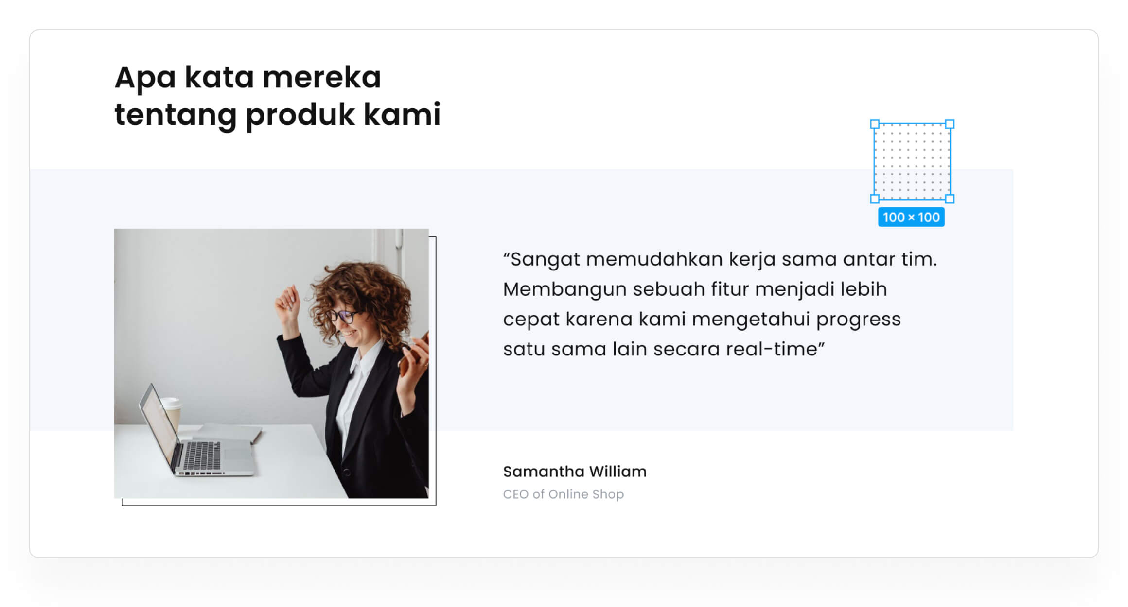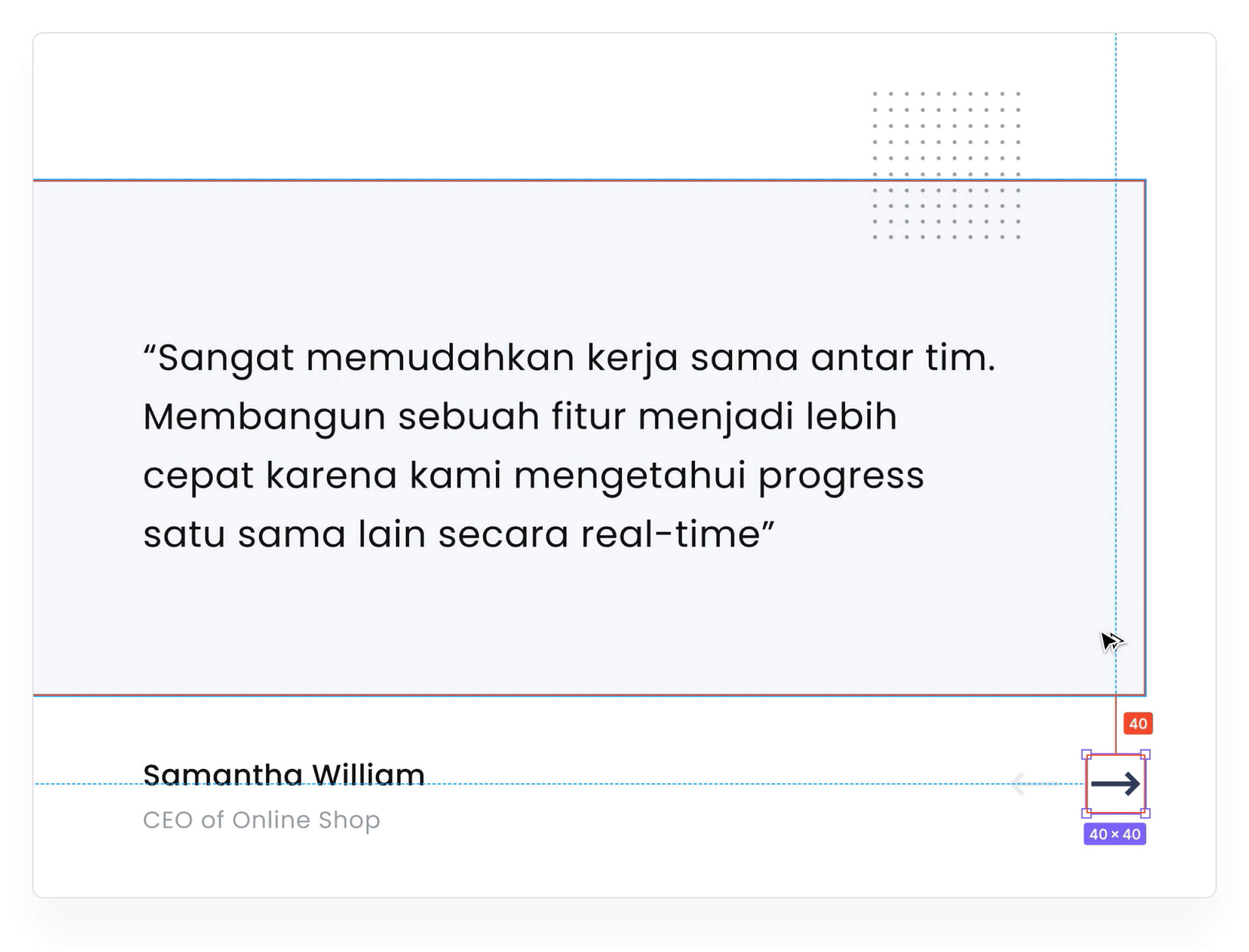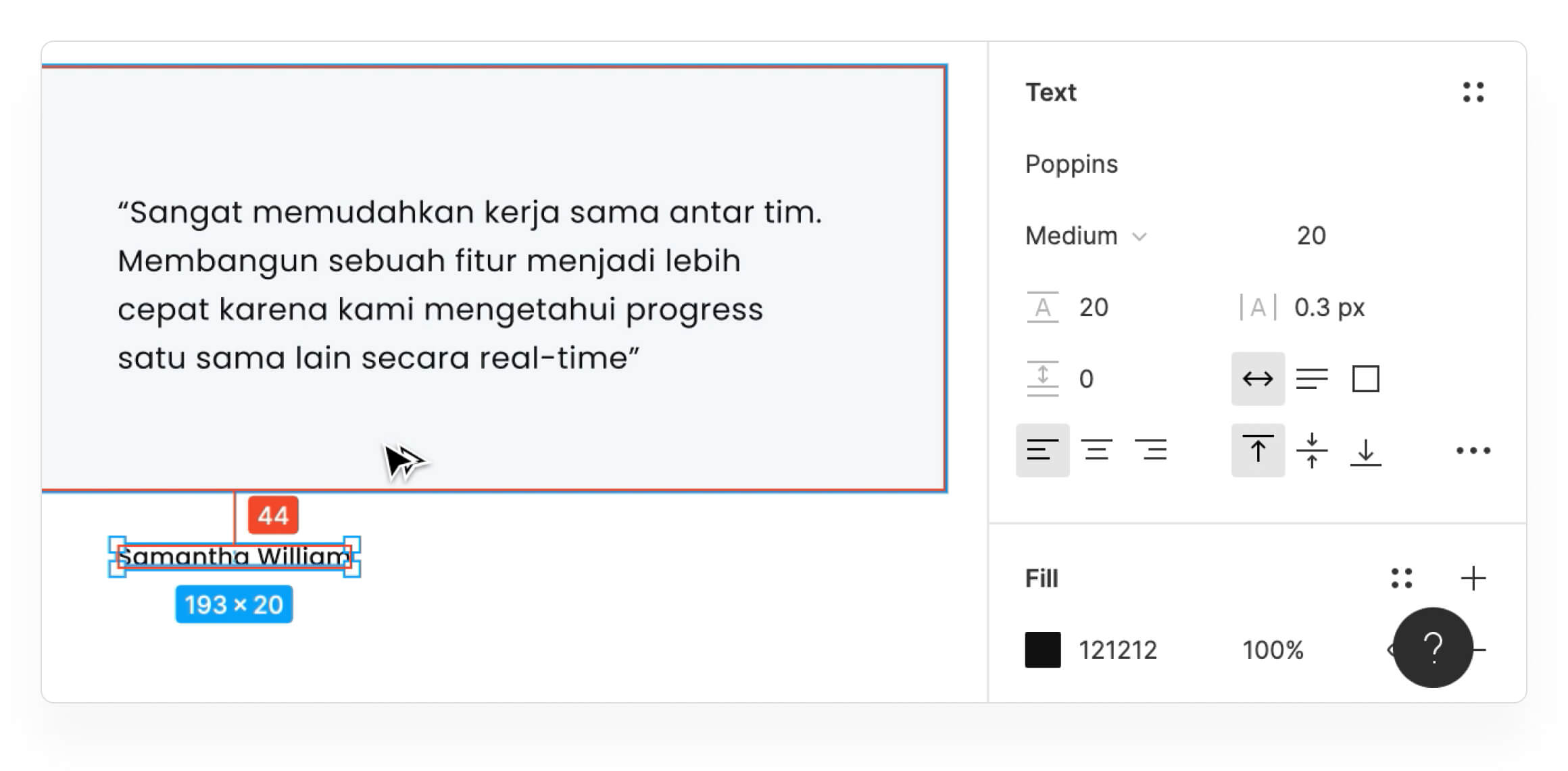 Lalu masukkan kutipan testimonial nya. Property teks ada di bawah ini ya, dan posisikan 100px dari atas dan kanan kotak background