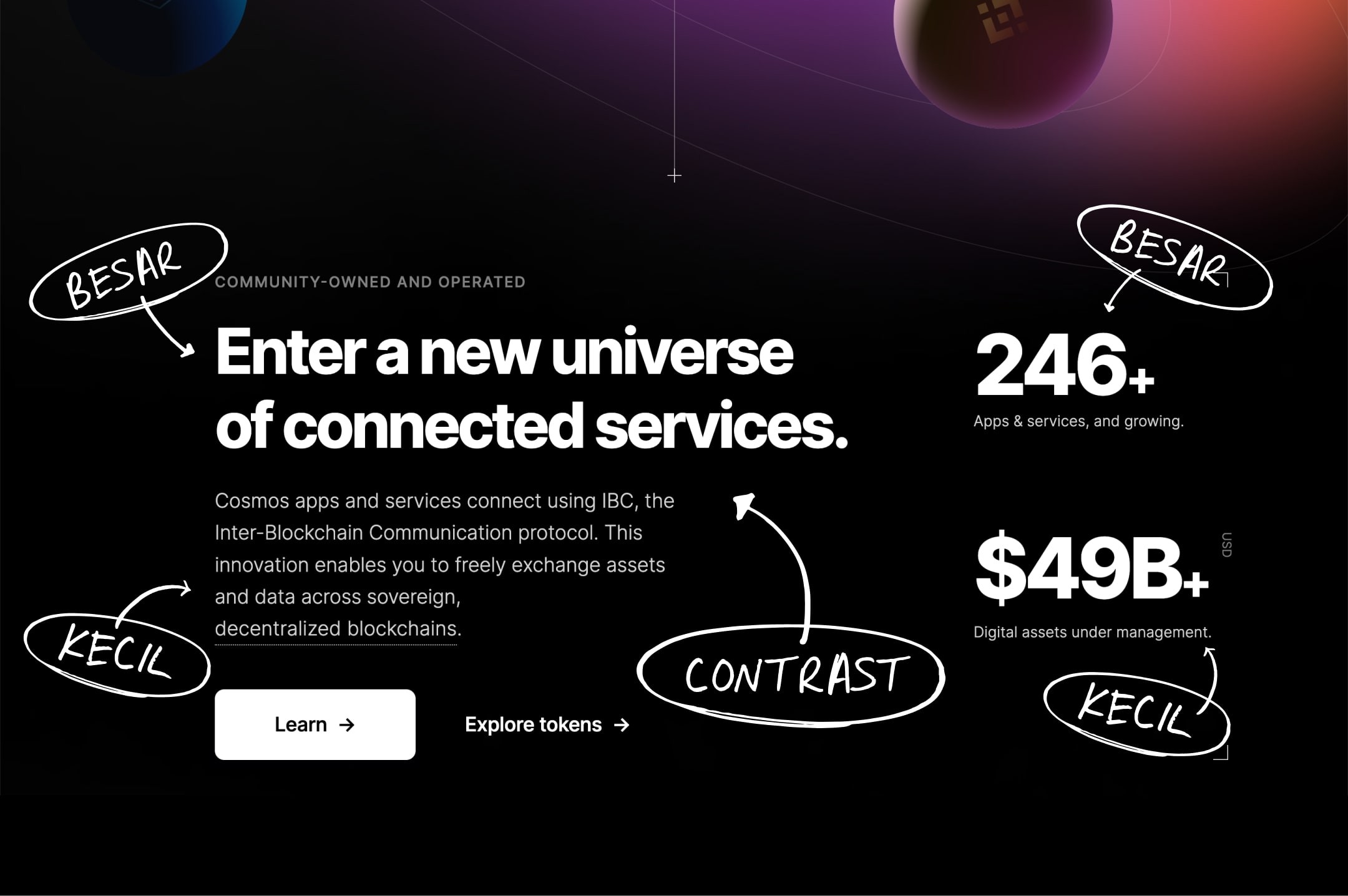 Apa yang membuat bold typography terasa spesial? Jawaban nya adalah kontras. Kontras yang dimaksud adalah kontras dalam hal perbedaan ukuran dengan teks di sekitar nya. Dengan adanya kontras akan membuat bold typography menjadi menonjol dan menjadi point of interest di suatu section atau bagian.