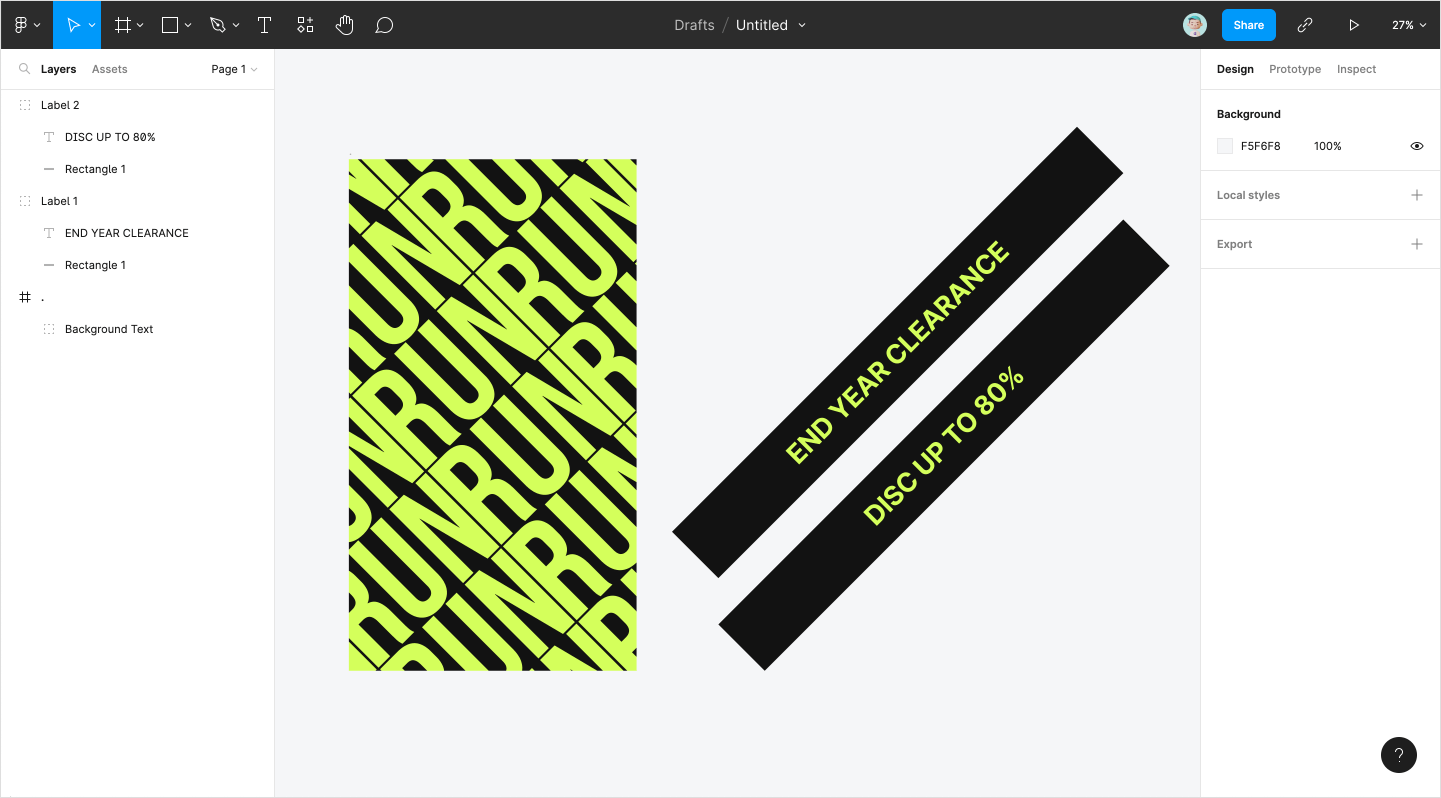 Lakukan grouping pada background label dan teks, beri nama grouping nya Label 1. Lalu miringkan grouping Label 1 sebesar 45 derajat.