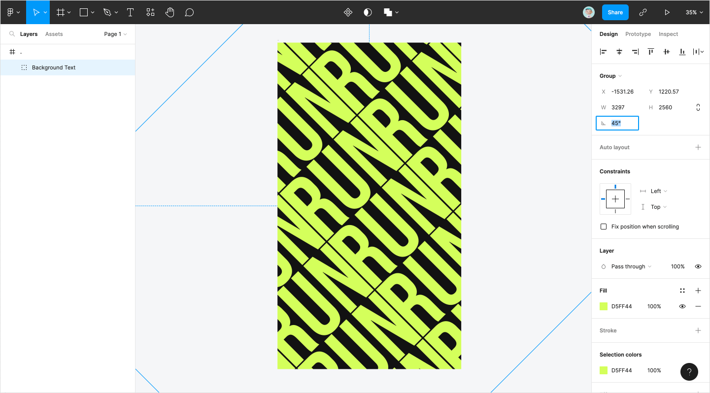 Miringkan Teks dengan cara select grouping Background Text, lalu miringkan 45 derajat pada panel sebelah kanan